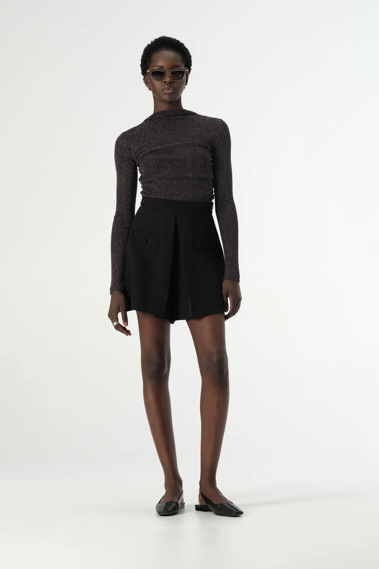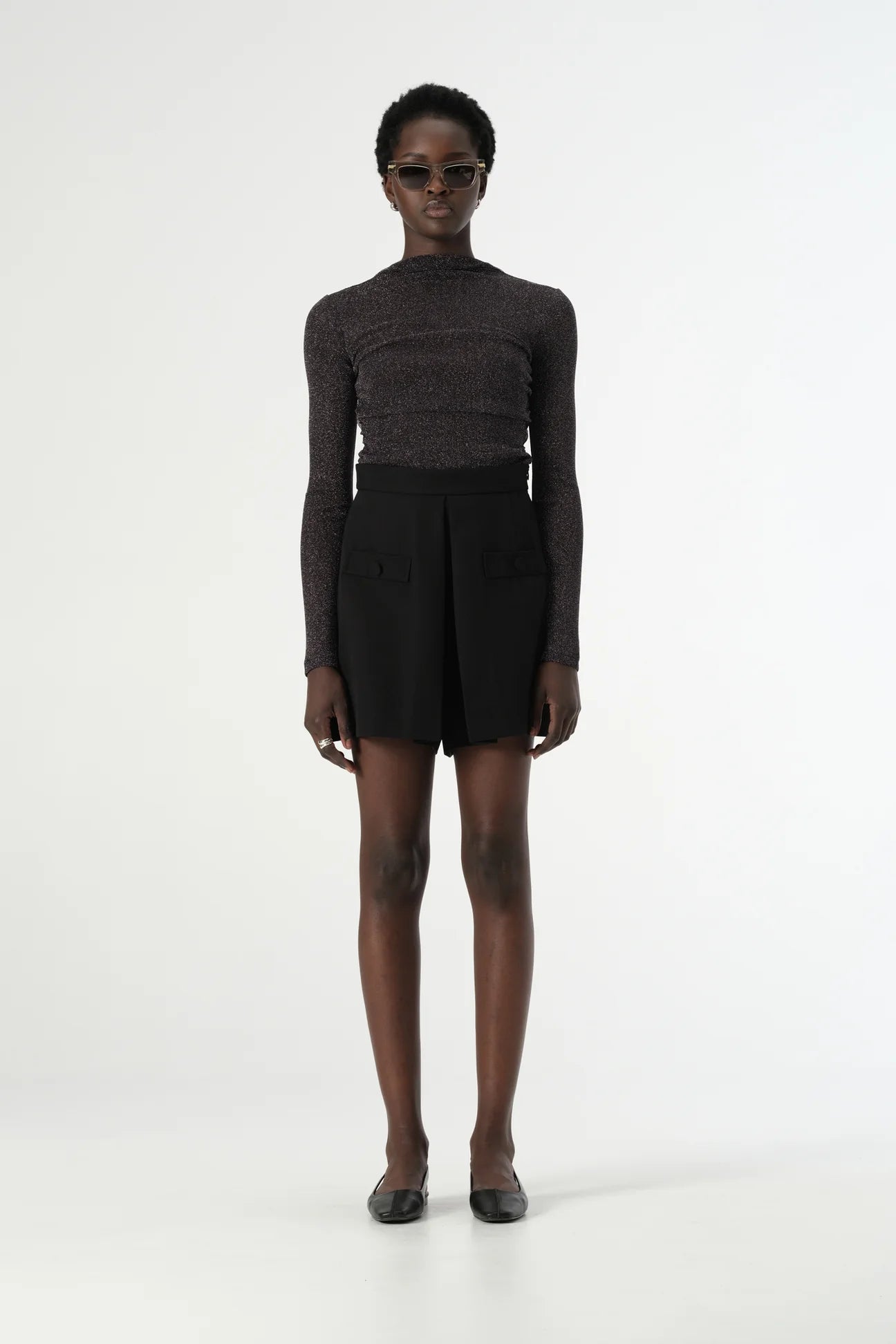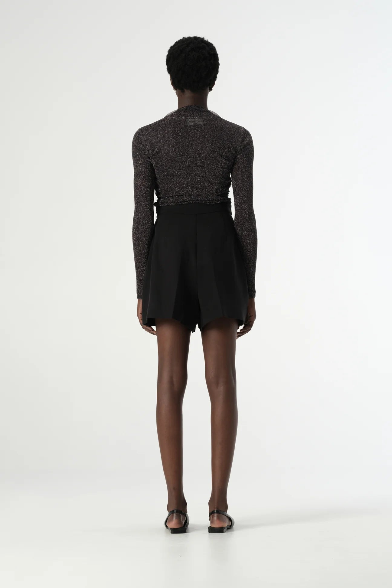 Elevated for taking your outfitting from day to night, the Elm Top is a simple and understated statement top. Made of our luxuriously soft and stretchy semi-sheer lurex mesh fabric, this long sleeve top is cut to a fitted silhouette with side seam gather detailing and a high mock neckline. As a lightweight layer, the Elm Top offers endless styling options - from tailored pants and jeans to flowing slip skirts and dresses. Add chrome accessories to bring your look together.
