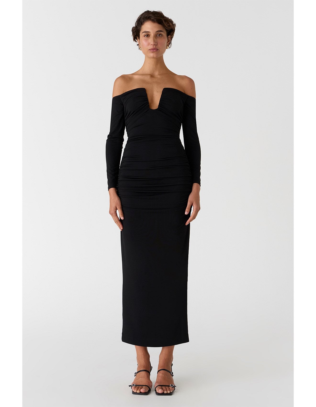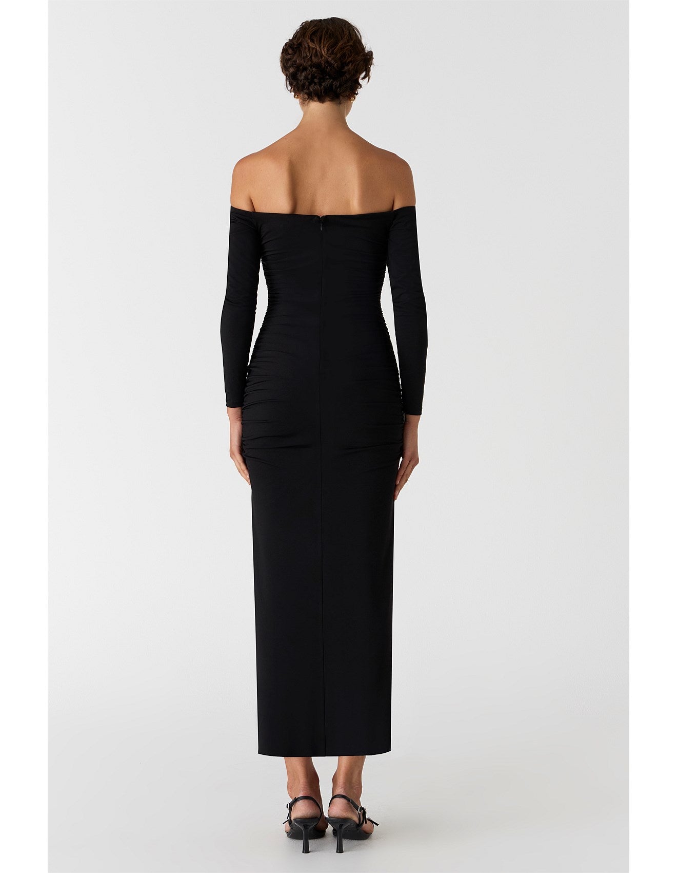 The Raelynn in Black, a sophisticated and refined take on an off-the-shoulder silhouette. Raelynn highlights the decolletage and cleavage, creating a sensual allure. This is balanced by the longer-line skirt and long-sleeve detail. Pair Raelynn with a pointed toe pump or strappy sandal to complete the look. The perfect dress for any evening event.