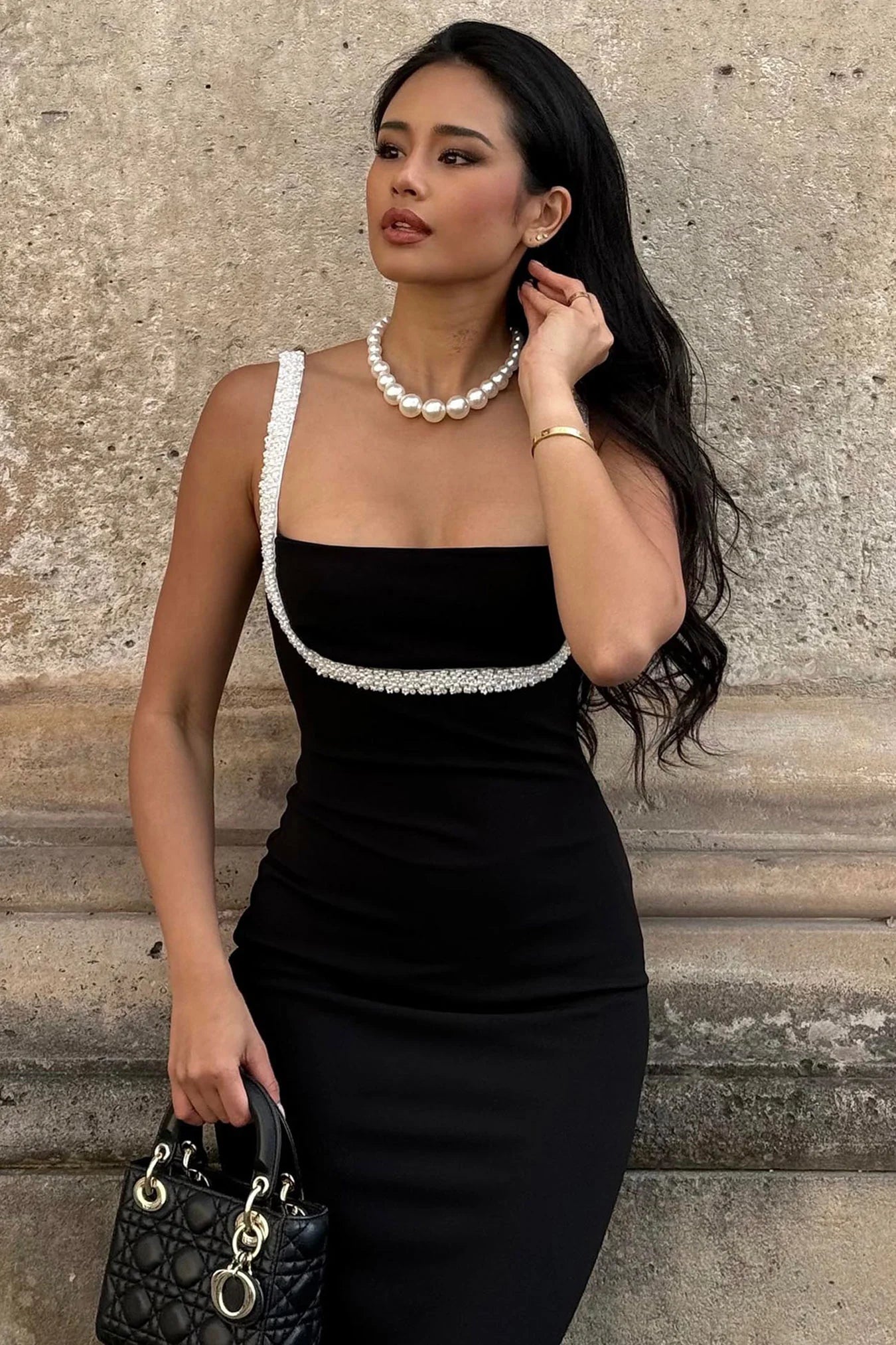 Beautiful bodycon style midi crafted from figure hugging scuba crepe. Features stunning pearl details at the bust & straps and a split at the back hem for ease of wear.