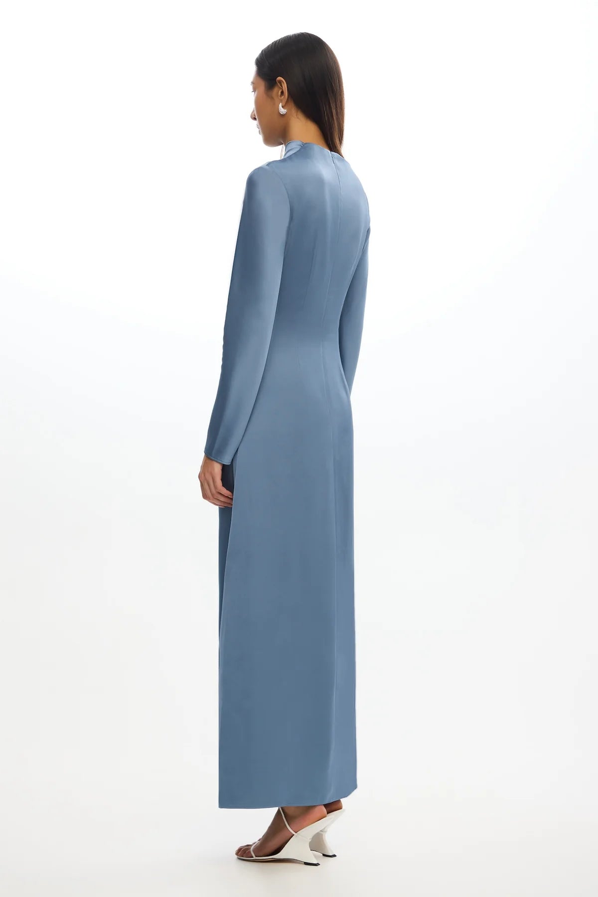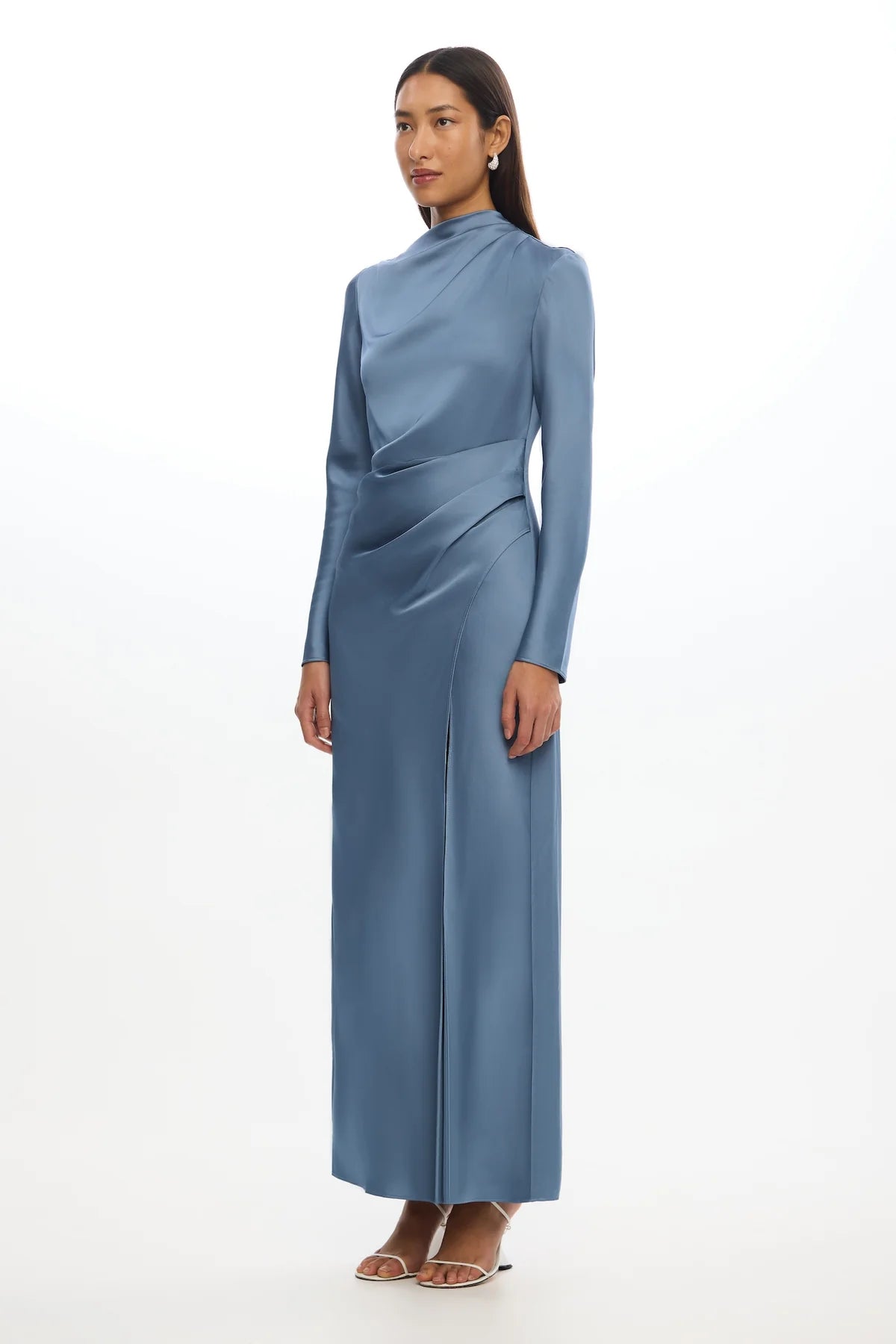 A sleek statement for special occasions, the Alyssa Long Sleeve Dress in Iron is designed with effortless elegance in mind. Draped details and a front split balance the high neckline and long sleeves, creating a striking silhouette. Perfect for modern weddings, evening events, or a sophisticated soirées.