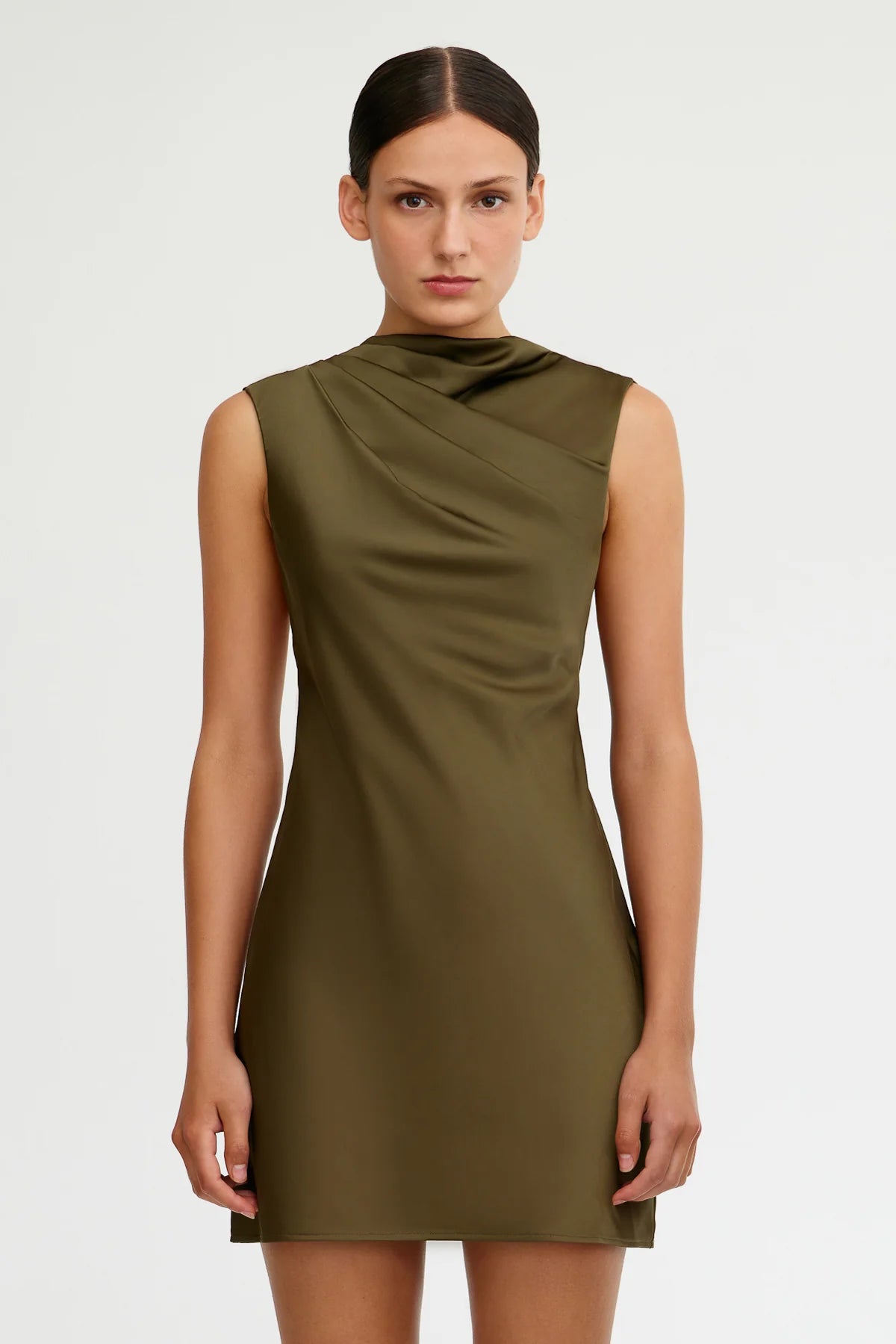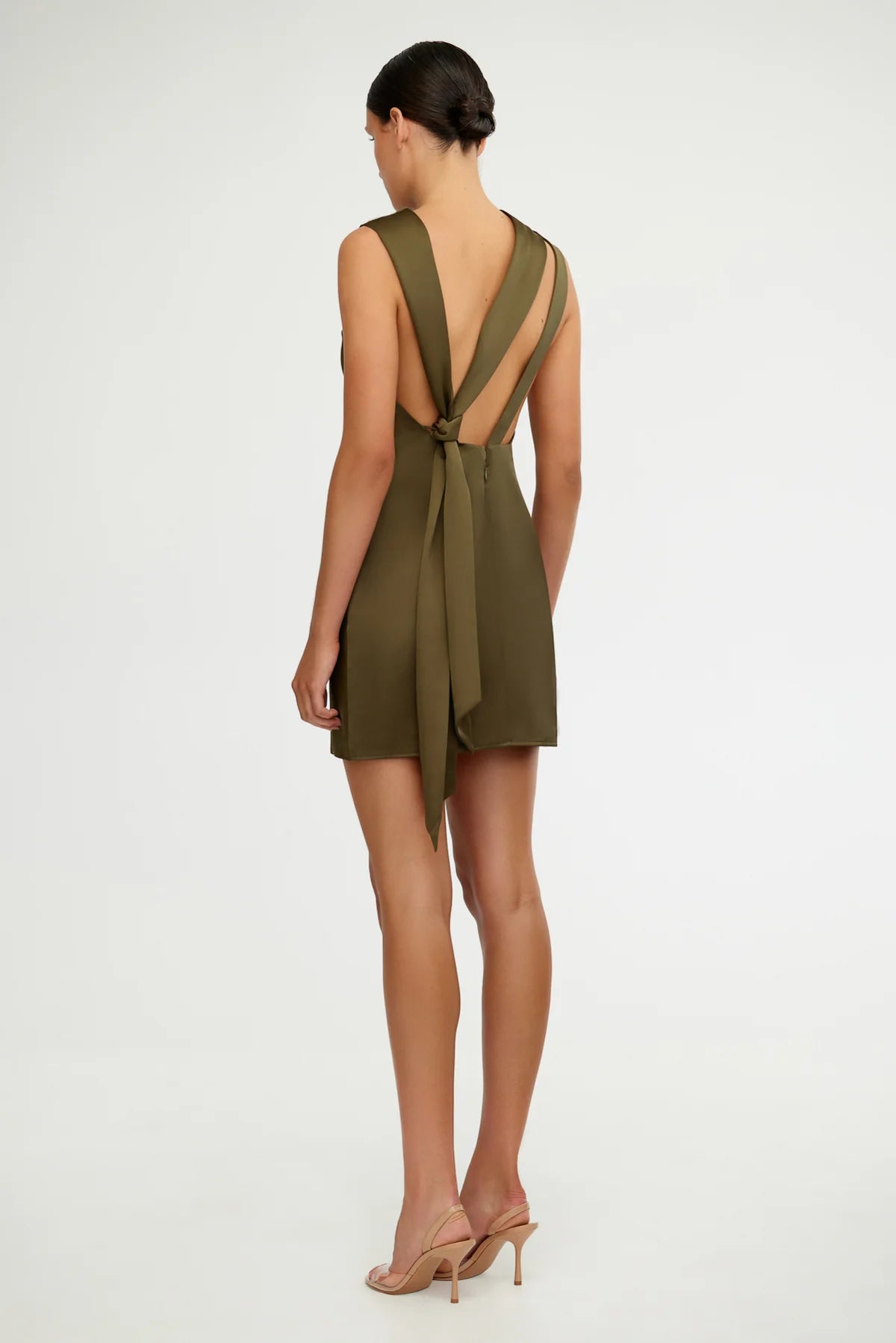 Our best selling Lana Dress has been reimagined for the event season ~ The Annabel Bias Mini Dress in Olive is an elegant silhouette. Featuring soft draping detail through the body and open back feature with adjustable back ties. A great option for bridesmaids.