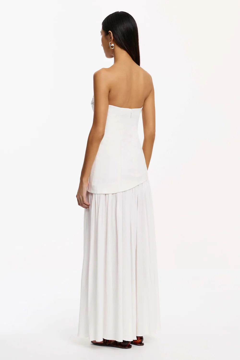 The Blyth Strapless Maxi Dress in Ivory captures a refined interplay of form and texture, embracing architectural shaping with a sense of quiet drama. A structured, boned cotton bodice‚ defined by precision pintuck lines‚ sculpts the silhouette, while a gathered cheesecloth skirt creates soft movement. The perfect choice for event dressing, this piece balances structure and fluidity with contemporary style.